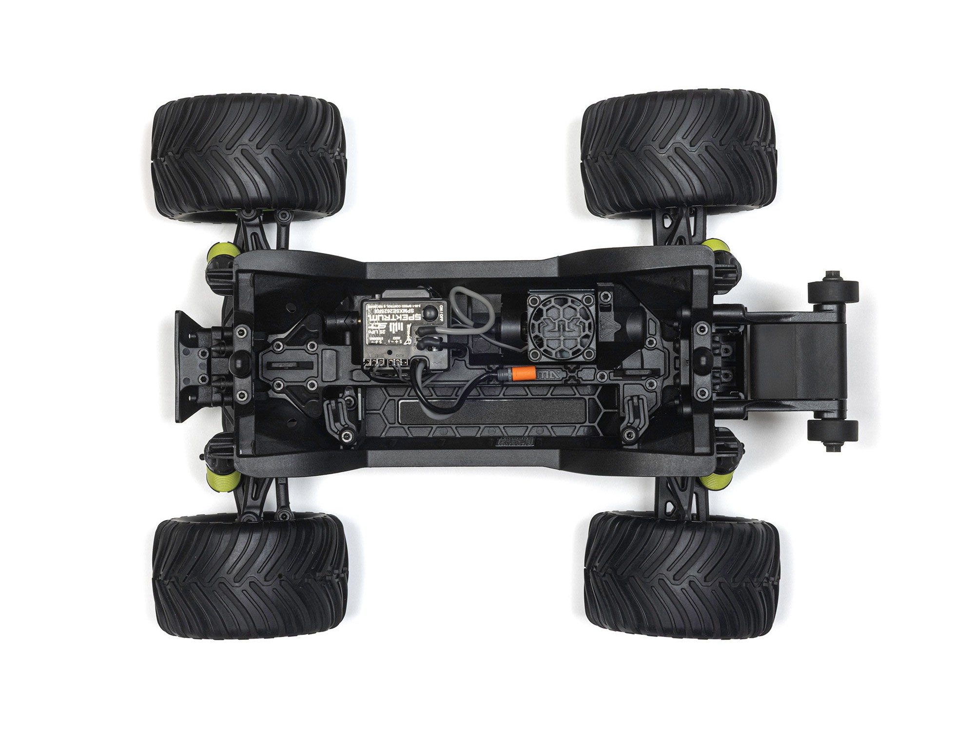 The enclosed drivetrain with rugged metal gears carries power from the installed Spektrum 380-Size Brushed Motor to all four wheels for high traction. The entyre power system is well-protected for dependable performance on all terrain.