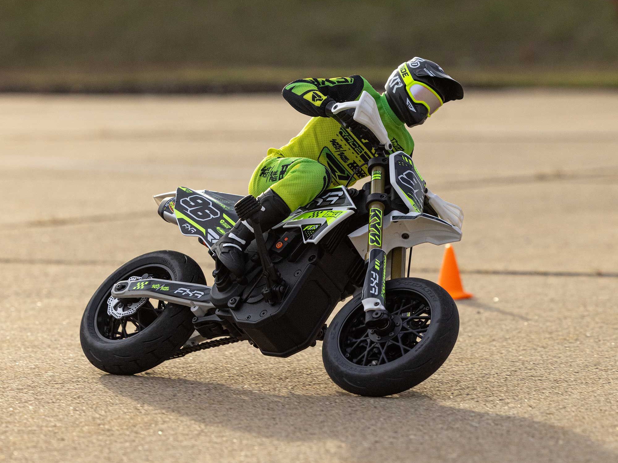 The Losi Promoto-SM also looks like a true supermoto bike. Its distinctive visual details include hand guards, shortened front fender, and officially licensed FXR graphics and rider gear.