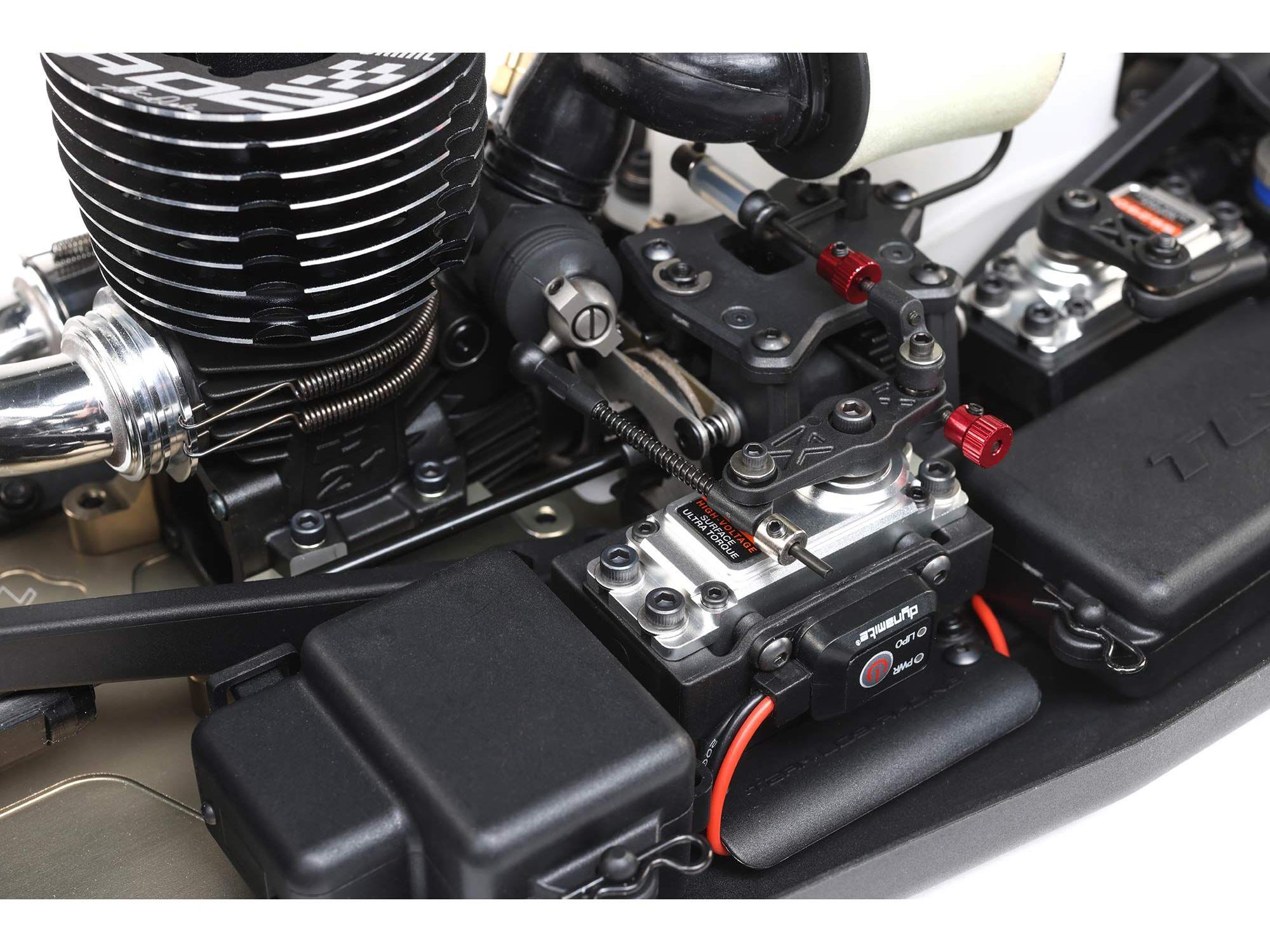 The steering servo has been moved in and forward to provide a better balance to the car. For the E version, the updated steering servo mount has an integrated ESC mount to get the ESC forward in the car.