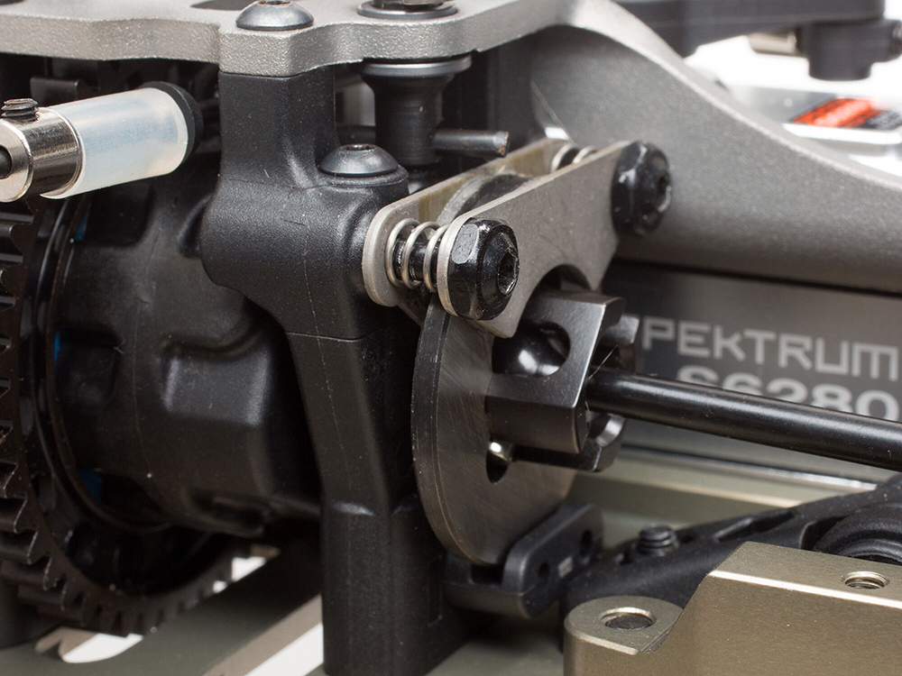 An updated radio tray now puts the throttle servo near the engine to eliminate additional linkage. The updated radio tray will ensure the throttle servo is rigidly mounted to avoid any flex by floating the servo off of the center differential.