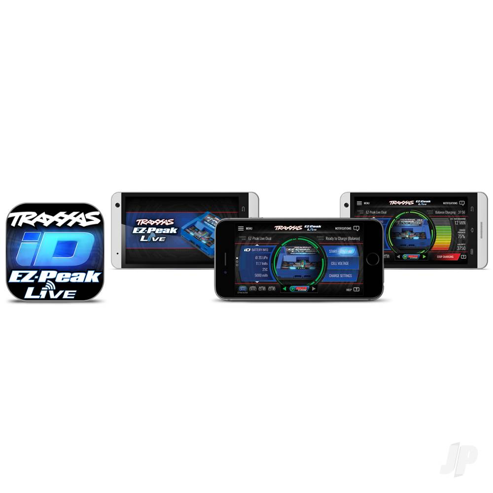 The new EZ-Peak Live Dual iD Charger takes all the advanced features of the EZ-Peak Live and supercharges the power output to over 26 amps (200 watts)! The 4s capable multi-chemistry dual charger uses built-in Bluetooth to work seamlessly with the new Traxxas EZ-Peak Live app for iOS and Android. The EZ-Peak Live app gives you detailed information, remote monitoring, and advanced operating functions through the high-definition colour interface on your mobile device. It s the most powerful, most advanced charger in the popular EZ-Peak lineup. Get back in the action sooner with the new EZ-Peak Live Dual Charger!