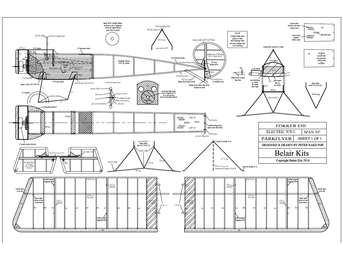 Designed for 40 watt electric motors, the Fokker Eindekker features a full CAD plan with constructional annotation, intricate laser cut parts in graded balsa and plywood.