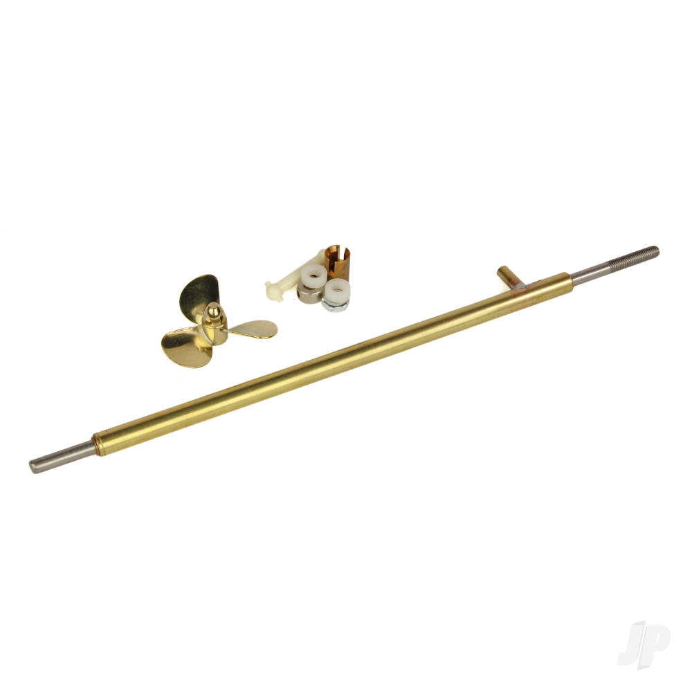 This direct drive single screw running hardware includes a 3/16″ dia. prop shaft, stuffing box, brass coupling and coupling rod. It also includes a 1-3/4″ diameter 3 bladed propeller.