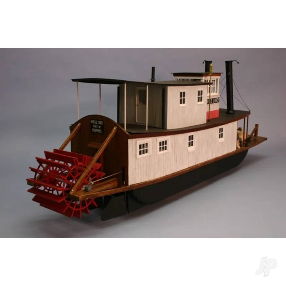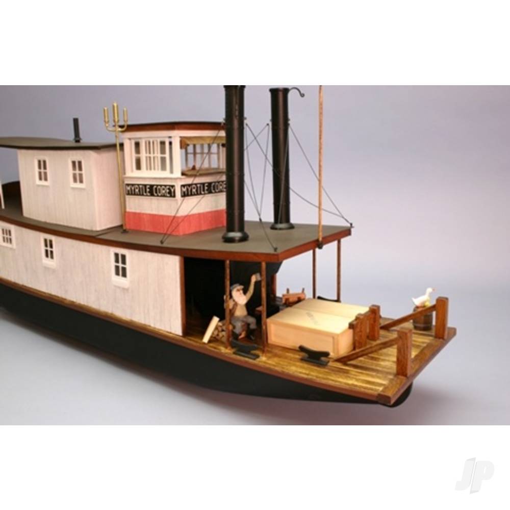 The Myrtle Corey is a fine example of a late 1800s river towboat. Typical of the day, these boats were site-built without plans, featuring many substitutions and jury-rigged construction. Once commonplace along the waters of the Mississippi and Arkansas Rivers, the Dumas model of the Myrtle Corey is designed to bring that remarkable era back to life. This kit features a vacuum-formed hull and roofs. The substructure is made from Die cut expanded PVC, and there’s a load of strip wood to provide the boat with its characteristic planked deck and cabin sides.