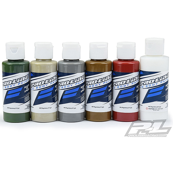 This is the all-new Pro-Line RC Body Paint All Pearl Color Set (6 Pack) – Mil Spec Green, Mojave Sand, Primer Gray, Dark Earth, Mars Red Oxide, Matte Clear specially formulated for Polycarbonate. Pro-Line’s Team of Innovators have painted literally thousands of RC car bodies over the years and now offers ready to spray R/C Body paints specially formulated to help you achieve the same jaw-dropping results we do. Developed by R/C body painters for painters, this water-based airbrush paint is ultra-flexible, extremely durable and easy to use. Have the confidence that you are spraying the best!